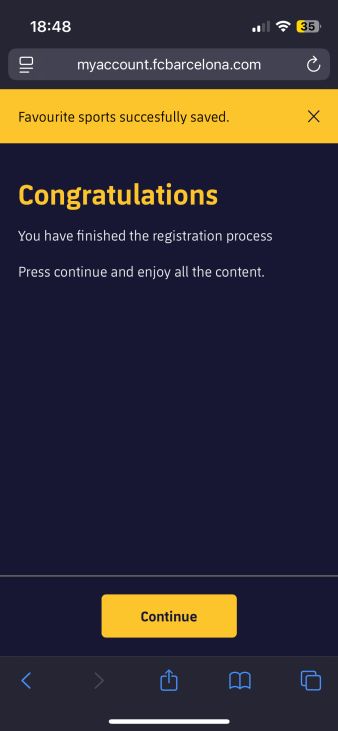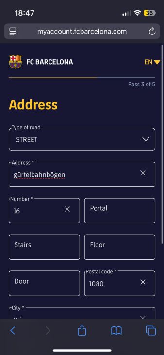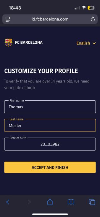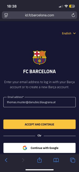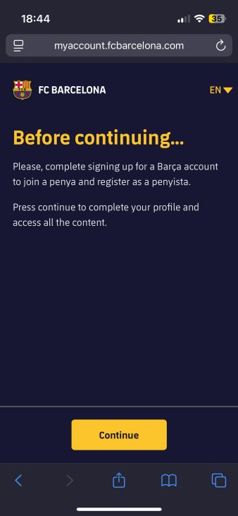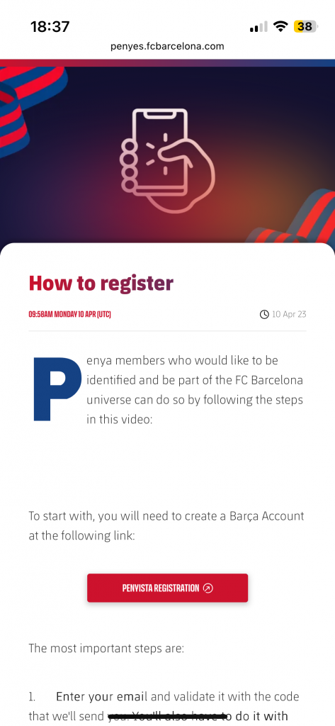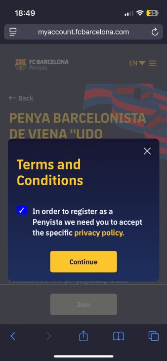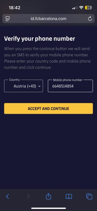 Auf der Seite FC Barcelona Penyes Seite den Button Penyes Registration klicken, als nächstes muss eine Email Adresse hinterlegt werden. Ihr bekommt nachdem Ihr Accept and Continue gewählt habt, einen 6-stelligen Code an die davor angegebene Emailadresse zugeschickt. Im nächsten Schritt ist noch Eure Telefonnummer anzugeben